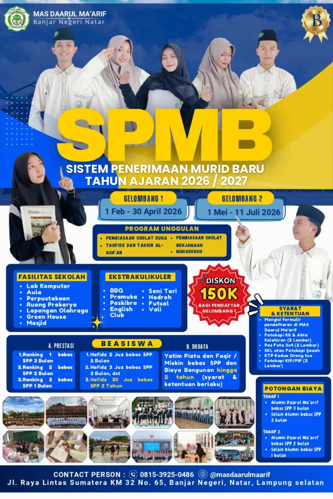 Madrasah Aliyah Daarul Ma’arif Banjar Negeri membuka kesempatan bagi putra-putri terbaik bangsa lulusan SMP/MTs sederajat untuk bergabung menjadi bagian dari keluarga besar kami.